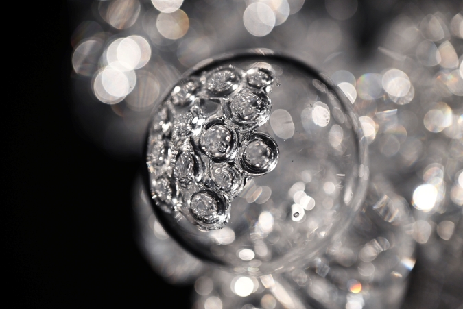 透明なガラスの造形が、ディープダークミラーの上に置かれることで、光と影が揺らぎ、神秘的な空間が生まれました。