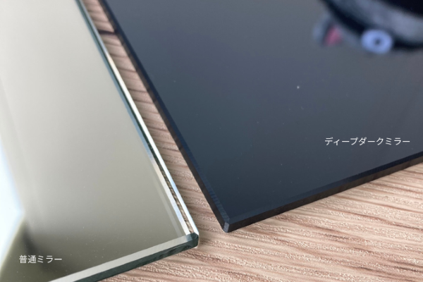 ディープダークミラーは、深みのある色合いと落ち着いた反射が特長のミラーで、住宅や店舗などのインテリアだけでなく、アート作品や展示演出にもご活用いただいています。