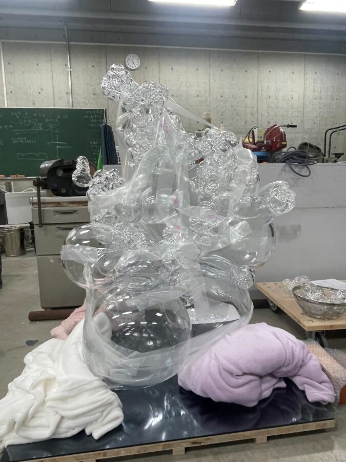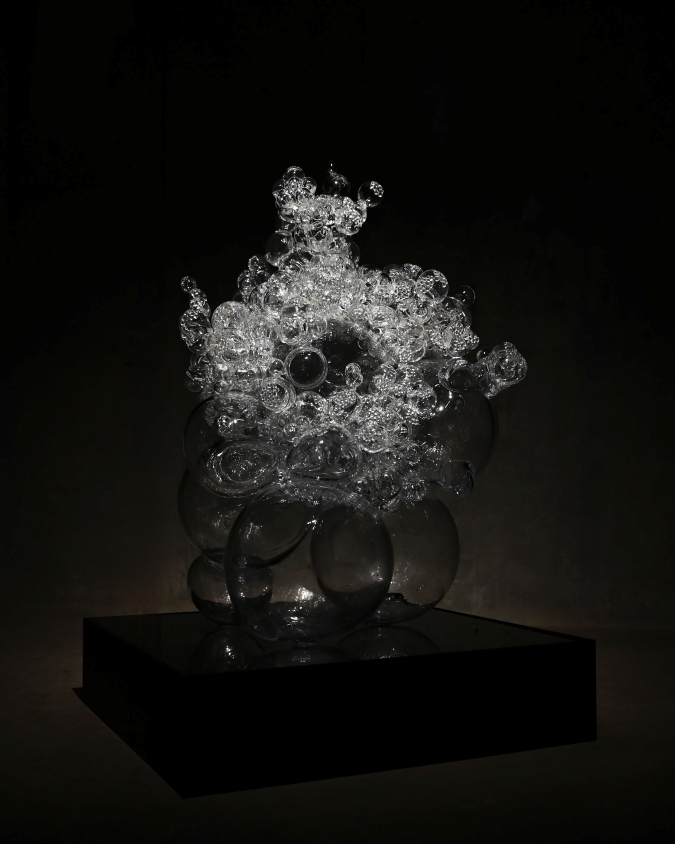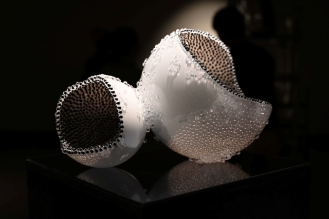 生命の起源である“細胞”をテーマに、吹きガラスと無数のガラス粒を用いて内側から湧きあがるエネルギーを表現された作品です。※本作品のガラス素材はご提供品ではありません。