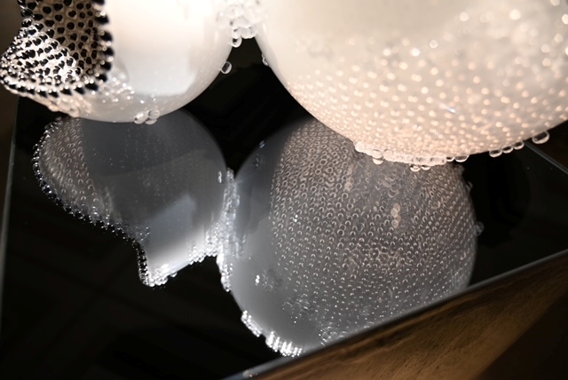 吹きガラスの内側に無数のガラス粒を接着する技法を用い、粒の密度や重なりによって生まれる異なる質感をつくり出した。その揺らぎは、生命が内部で増殖し、静かに湧きたつ状態を可視化するものである。光を受けたガラス粒は反射や影を生み出し、透明と不透明、静と動、儚さと強さといった相反する要素が、ひとつのかたちの中に共存する。