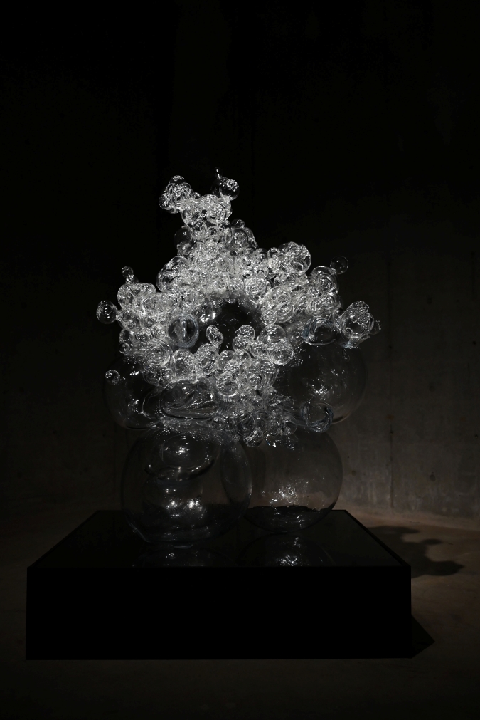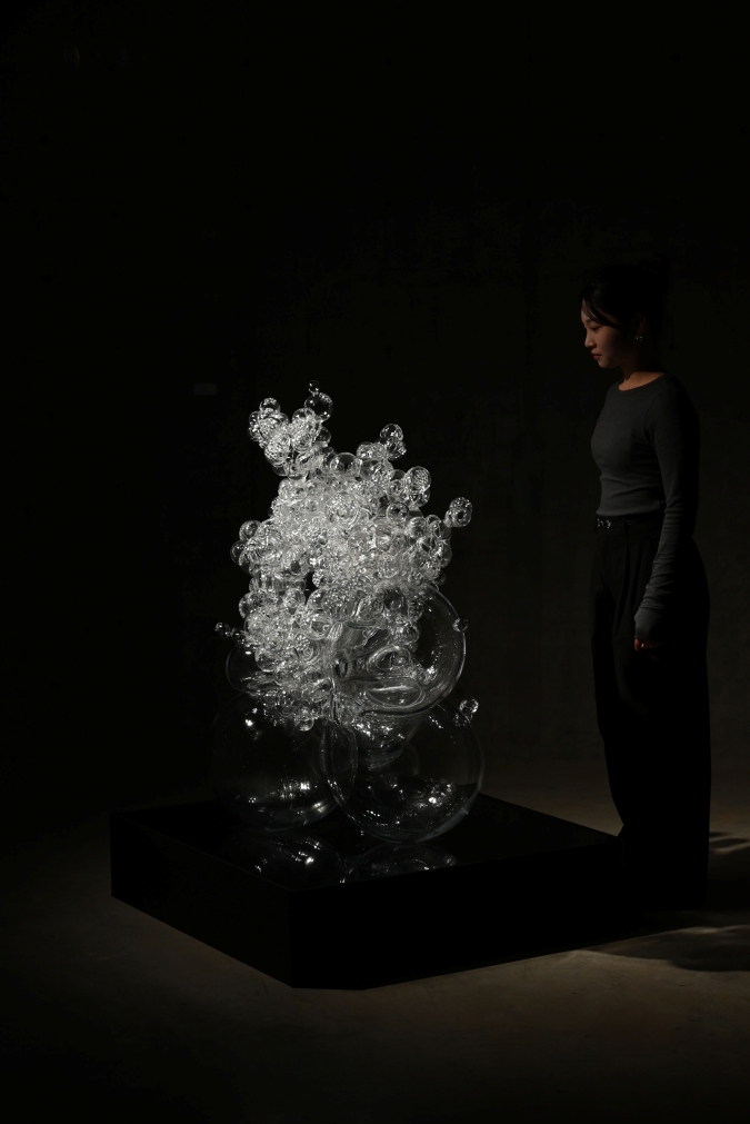 私は、ガラスに光が差し込むことで現れる「透明の中の色」に強い魅力を感じている。光のきらめきや影の濃淡は、細胞が内側で呼吸しているかのような印象をもたらす。細胞の成長に宿るエネルギーと、ガラス素材がもつ透明の奥行きを感じてほしい。